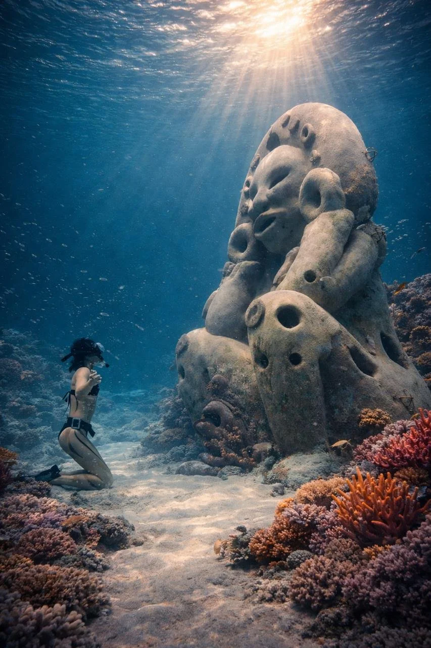 Today, we continue this lineage of offering. By placing sculptures into the ocean, we extend an ancient practice into the present — not as replicas of the past, but as living prayers. These works are offerings to the sea: acts of respect, remembrance, and prayer for the return of abundant coral reefs and thriving marine ecosystems and a globally regenerative future for all.