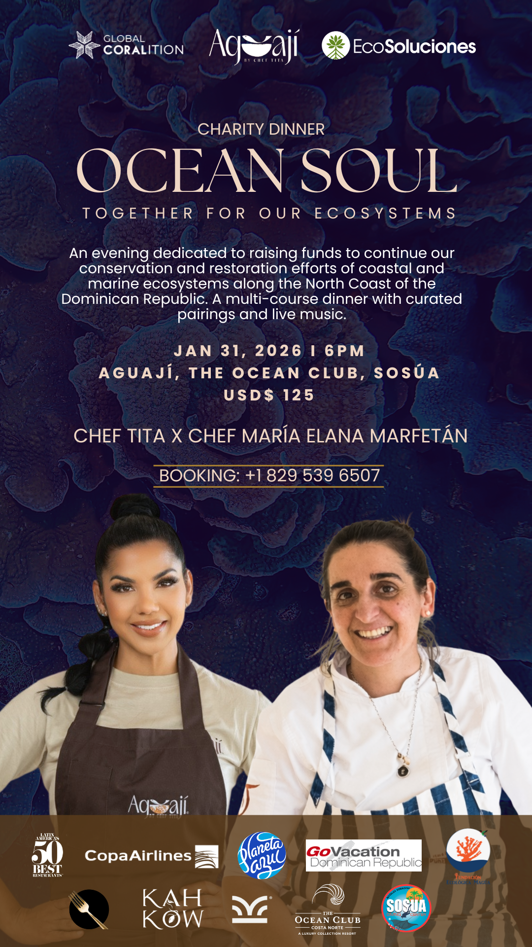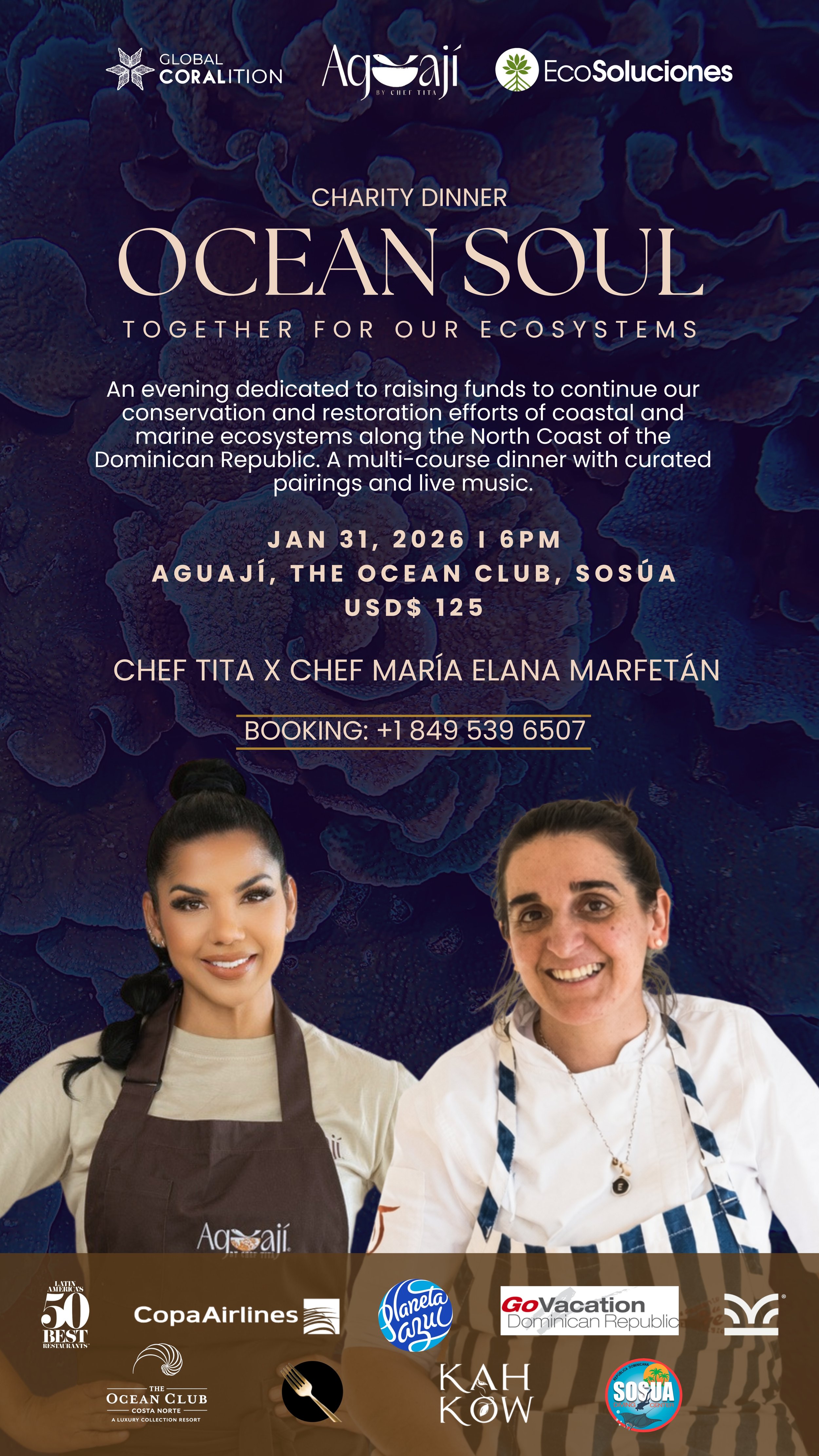 At the crossroads of gastronomy and conservation, Ocean Soul is a tribute to the sea where flavor and purpose meet. Created by Global Coralition and produced by Un Tenedor Dorado, this benefit dinner brings together acclaimed chefs María Elena Marfetán of Uruguay and Chef Tita Páez of the Dominican Republic for an evening devoted to coral reef and mangrove restoration. Hosted at Aguají Restaurant in The Ocean Club Costa Norte, Ocean Soul invites guests to experience the ocean through taste and emotion, turning each dish into a gesture of care for the planet.
